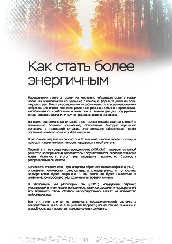 Этот ДНК анализ показывает влияние наиболее важных 10 генов на психическое и эмоциональное состояние. Именно они регулируют выработку гормонов, работу нейромедиаторов. Используйте знания о природных свойствах своего организма для борьбы со стрессом, повышения работоспособности и общего тонуса. Каждый человек индивидуален, поэтому мы рекомендуем пройти наш генетический нейро тест в Яхроме.